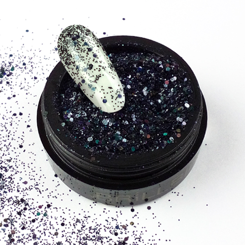 Holografikus színjátszó csillámpor, kétféle méret keverékével a kis szemcsék kitöltik a nagyok közeit, így nem fog átlátszani.