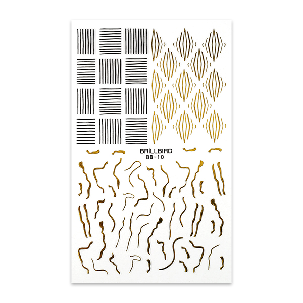 A szett 3 különböző nonfiguratív mintát tartalmaz, melyek arany és fekete színekben érhetők el. Ezekkel a könnyen használható matricákkal egyszerre készíthetsz feltűnő és elegáns körmöket – tökéletes választás minden alkalomra!